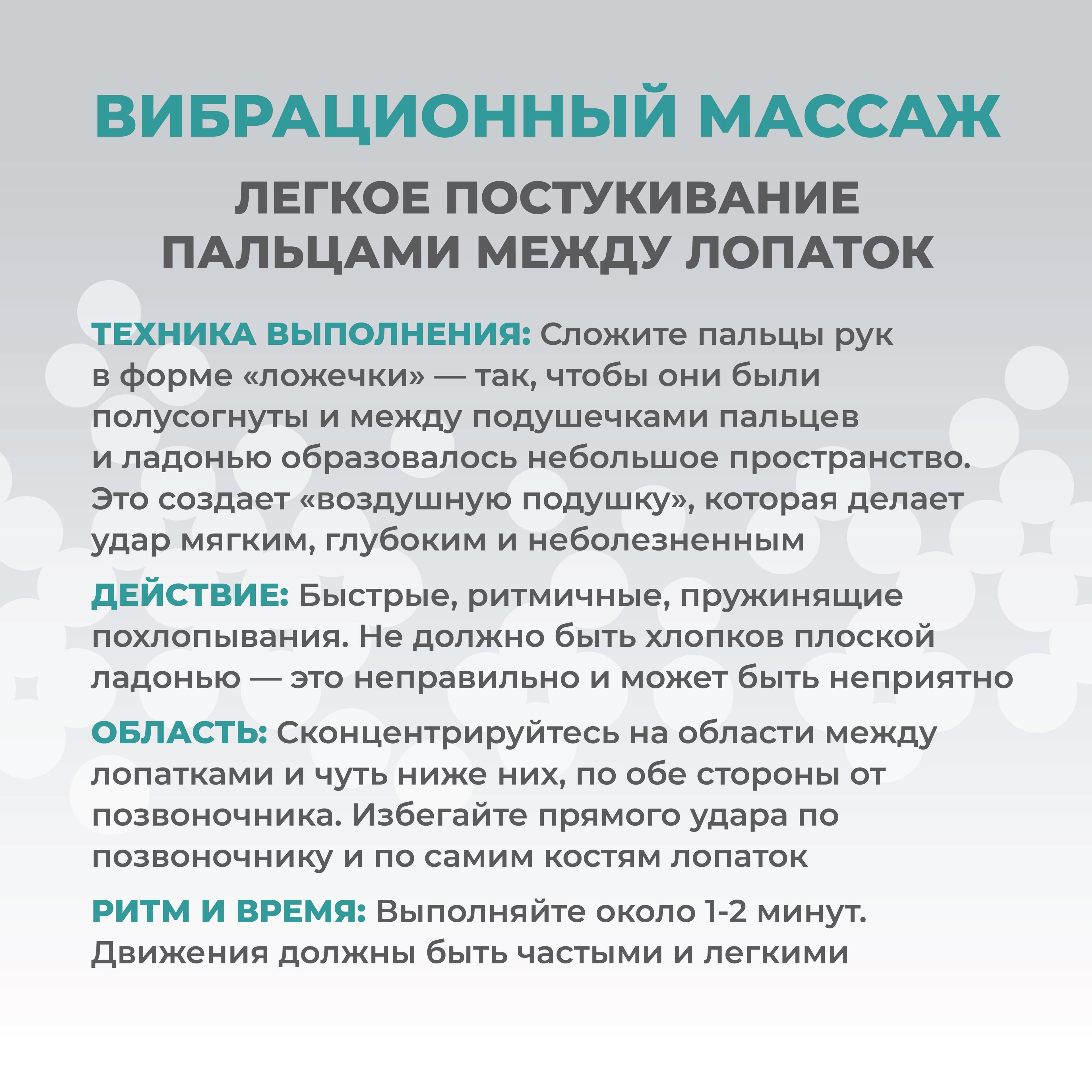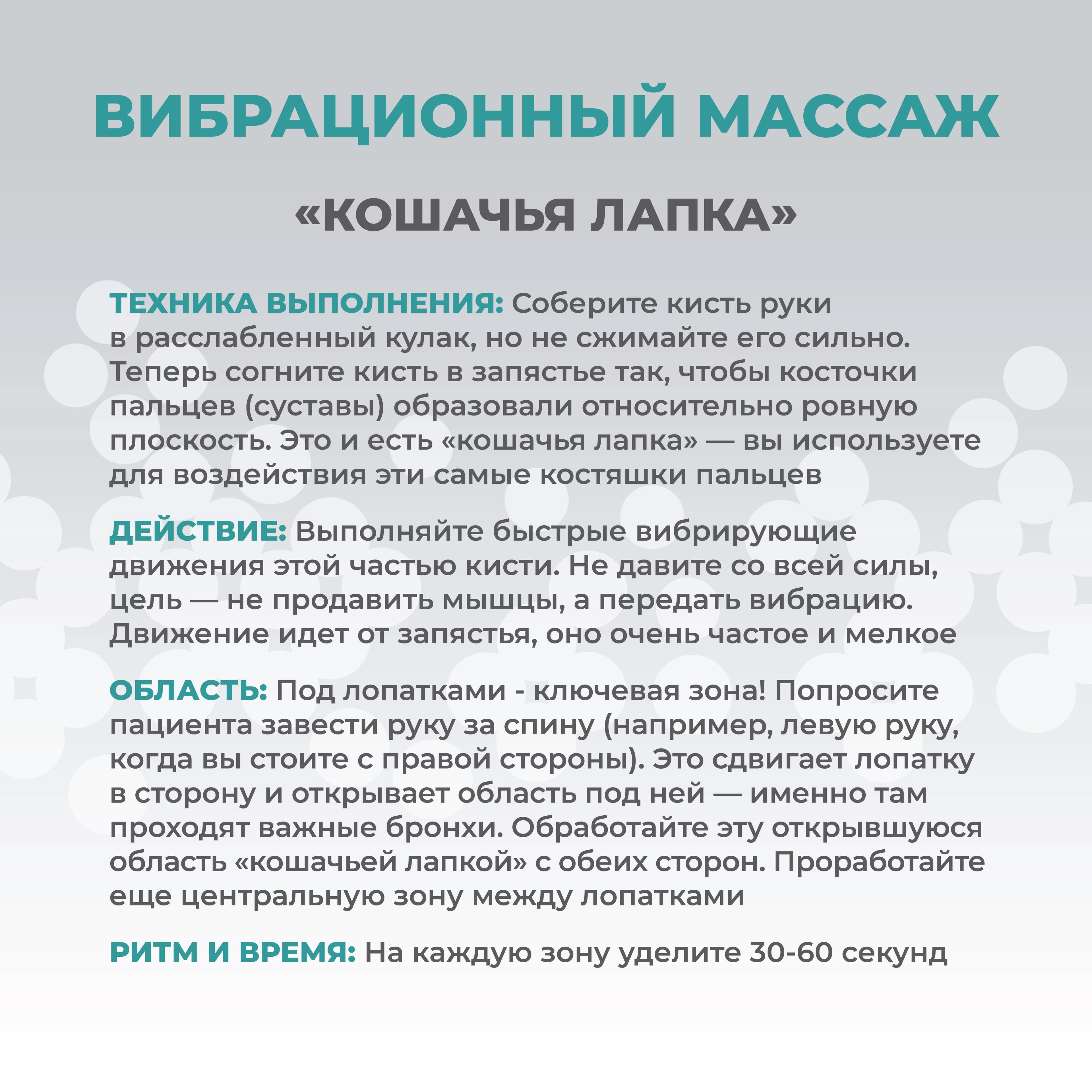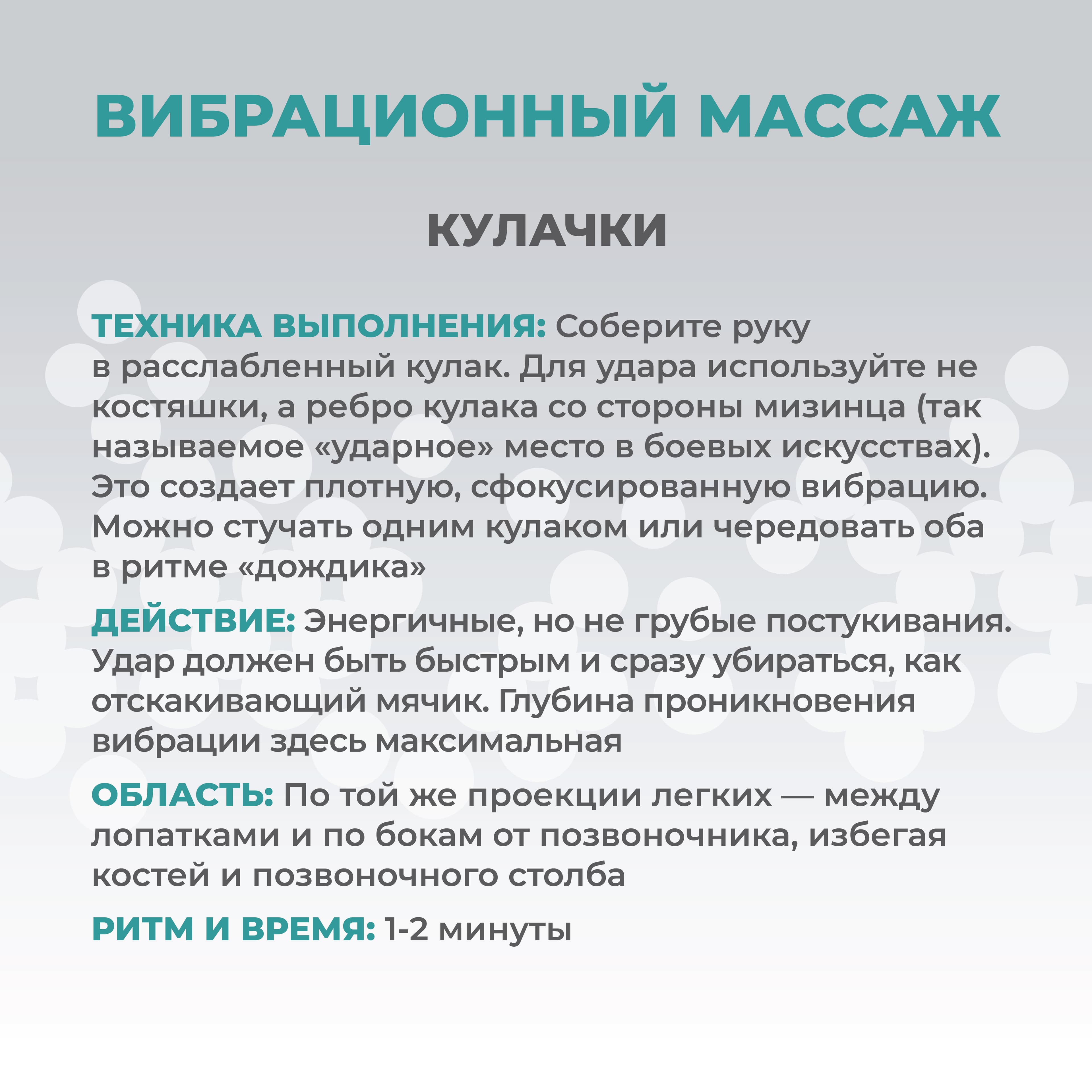 - Вибрационный массаж. Эта процедура улучшает кровообращение и способствует отхождению мокроты (подробнее в карточках)