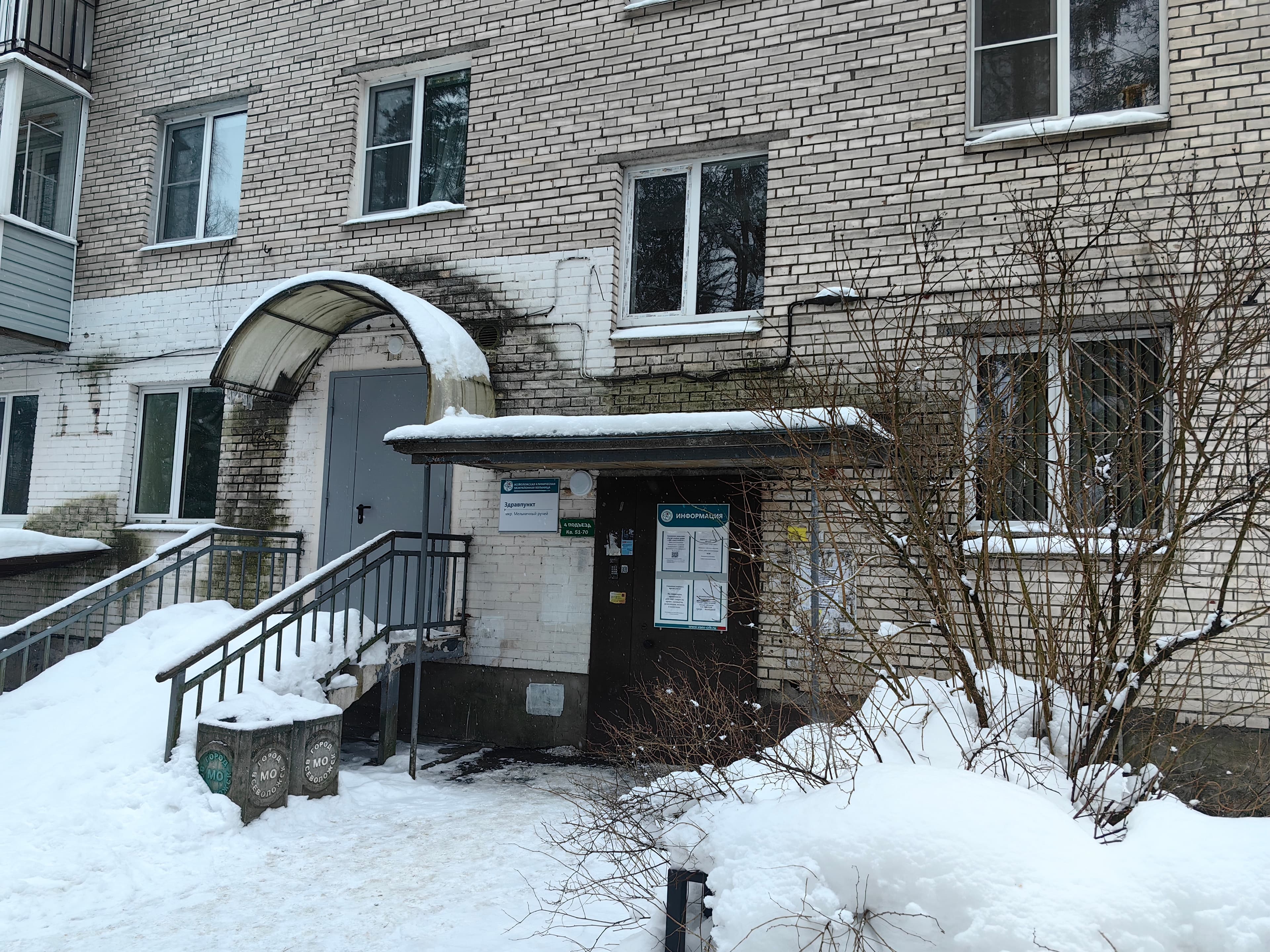Кабинет врача-терапевта Мельничный ручей организован на 1 этаже жилого дома по адресу г. Всеволожск, ул. Комсомола д. 2.